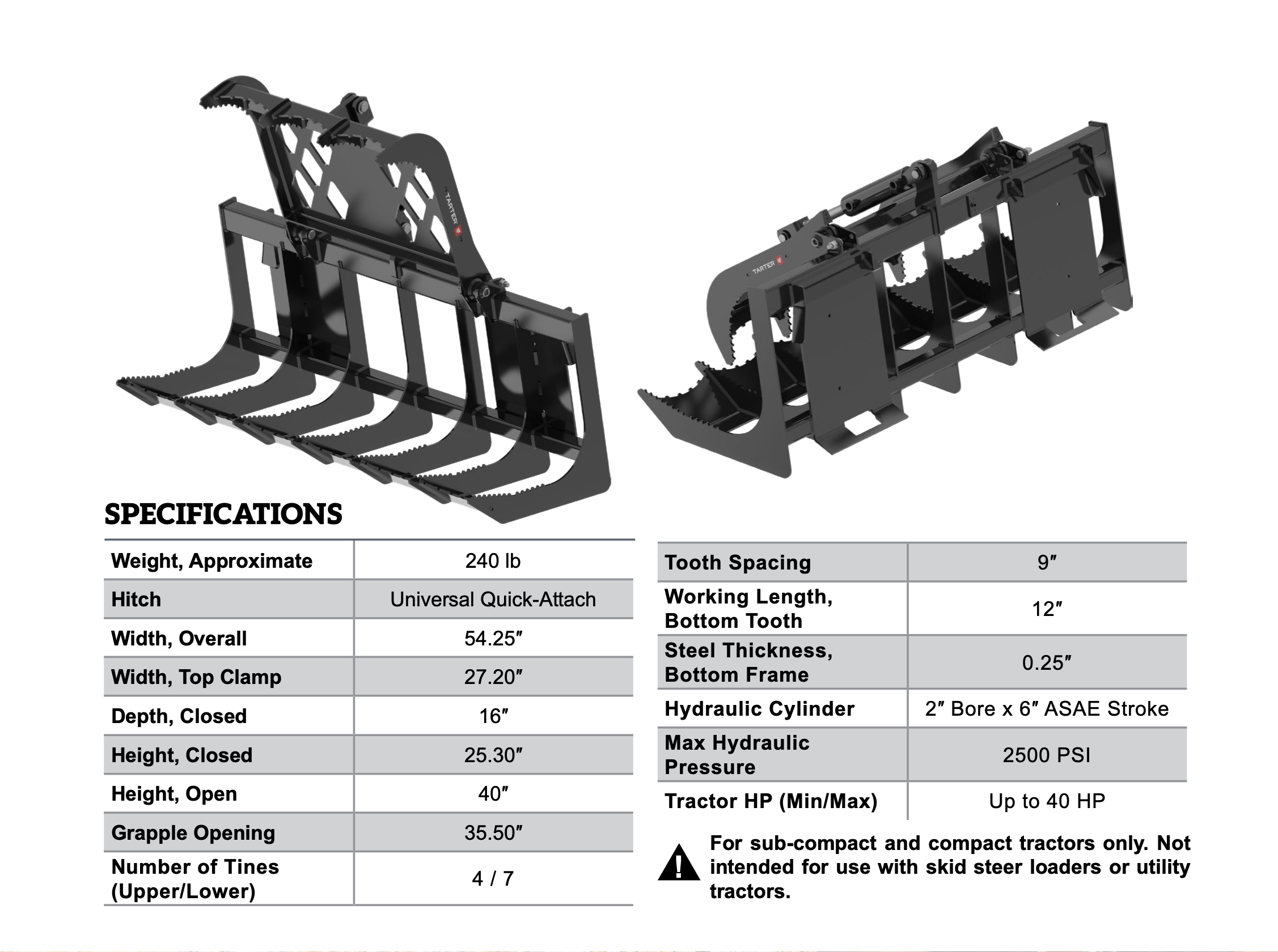 Built for versatility and ease of use, this single clam root grapple makes quick work of brush, roots, logs, and debris. Designed for compact tractors up to 40 HP, the single upper jaw delivers strong clamping power for secure handling while maintaining excellent visibility and precision. A universal quick-attach hitch ensures easy compatibility with most compact tractors, while the open-bottom design allows dirt to fall away for faster, more efficient cleanup during landscaping, land clearing, and property maintenance tasks.